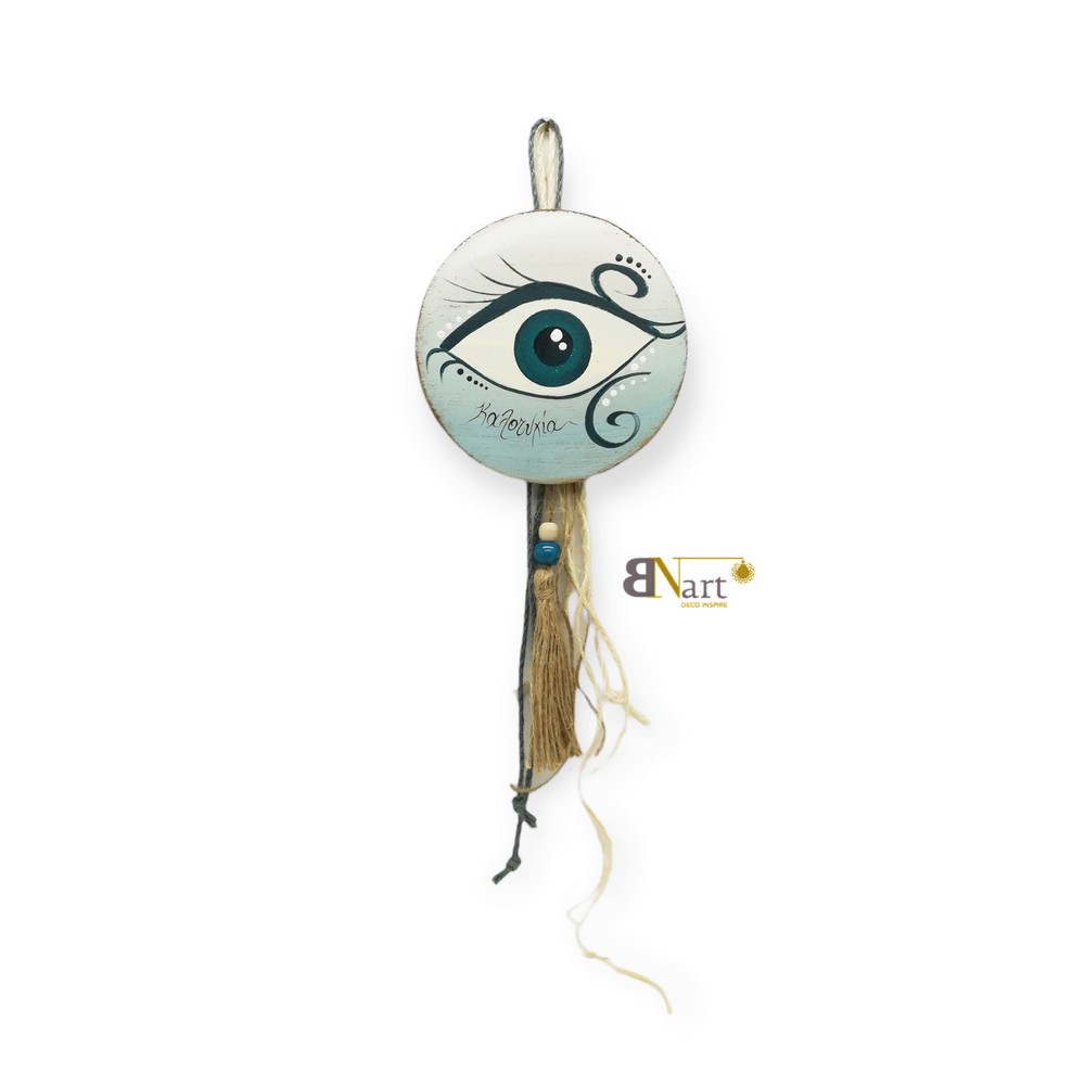 Γούρι σε στρόγγυλο σχήμα με σχέδιο μάτι, στολισμένο με κορδέλες και φούντα λινάτσας με χάντρες.